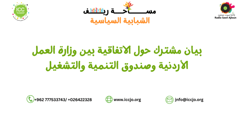 يرحب مركز وسطاء التغيير للتنمية المستدامة، وإذاعة صوت عجلون المجتمعية، ومساحة ريف الشبابية السياسية الآمنة، بتوقيع الاتفاقية بين وزارة العمل الأردنية وصندوق التنمية والتشغيل، والتي تهدف إلى تمويل ودعم المشاريع المنزلية الصغيرة من خلال تقديم قروض حسنة ميسرة لخريجي مؤسسة التدريب المهني.