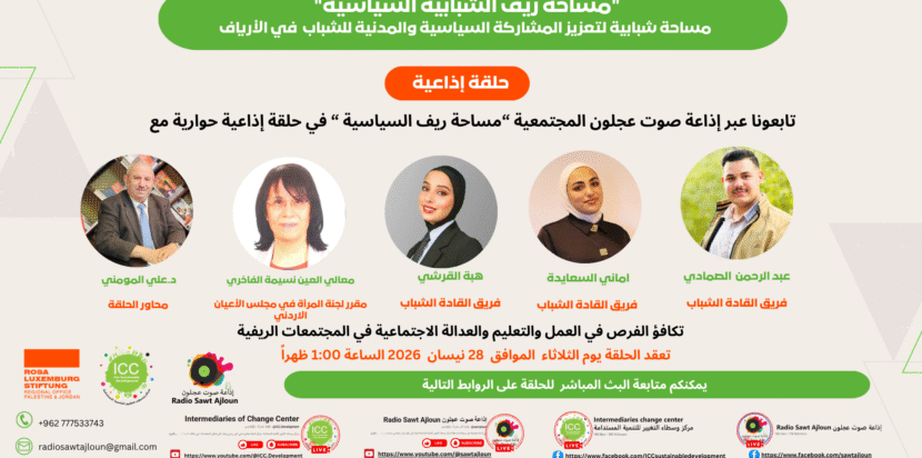 📌 يُذكر أن مشروع “مساحة ريف” ينفذه مركز وسطاء التغيير للتنمية المستدامة بالشراكة مع إذاعة صوت عجلون المجتمعية، وبالتعاون مع مؤسسة روزا لوكسمبورغ الألمانية، ويهدف إلى توفير مساحة شبابية آمنة ومستدامة لتعزيز المشاركة المدنية والسياسية للشباب في الأرياف.