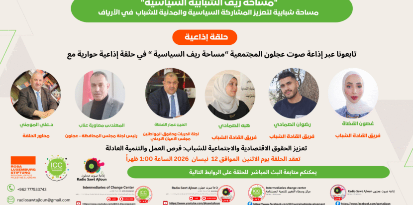 تستضيف إذاعة صوت عجلون المجتمعية حلقة حوارية مميزة ضمن أنشطة مشروع مساحة ريف الشبابية الآمنة، لمناقشة أبرز القضايا المرتبطة بالحقوق الاقتصادية والاجتماعية للشباب، وسبل تعزيز فرص العمل وتحقيق التنمية العادلة في محافظة عجلون.