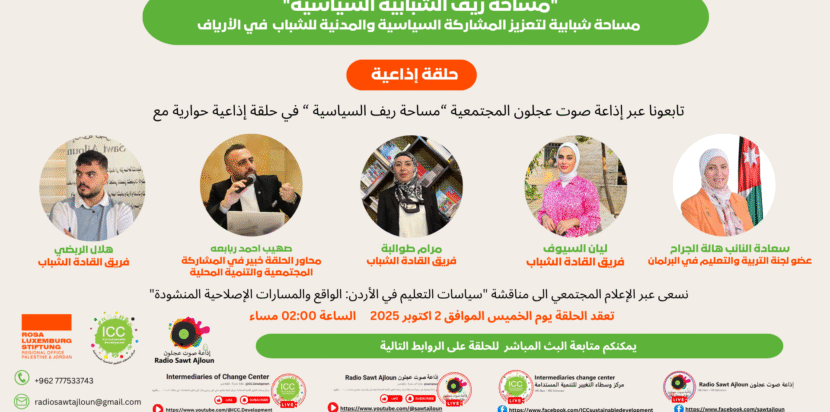 Follow us for the political dialogue: “Education Policies in Jordan: Reality and Desired Reform Pathways”, part of the Safe Rural Youth Political Space project, implemented by the Change Mediators Center for Sustainable Development, in partnership with Sawt Ajloun Community Radio, and in collaboration with the Rosa Luxemburg Foundation – Germany.