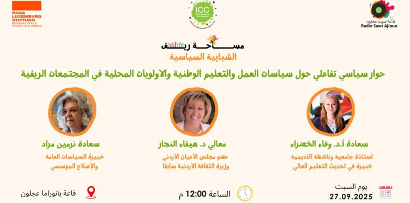Ajloun – As part of efforts to enhance the political and civic participation of youth in rural areas, the Intermediaries Change Center for Sustainable Development, in partnership with Sawt Ajloun Community Radio and in cooperation with the Rosa Luxemburg Foundation – Germany, is organizing an interactive political dialogue on “National Labor and Education Policies and Local Priorities in Rural Communities” on Saturday, September 27, 2025.